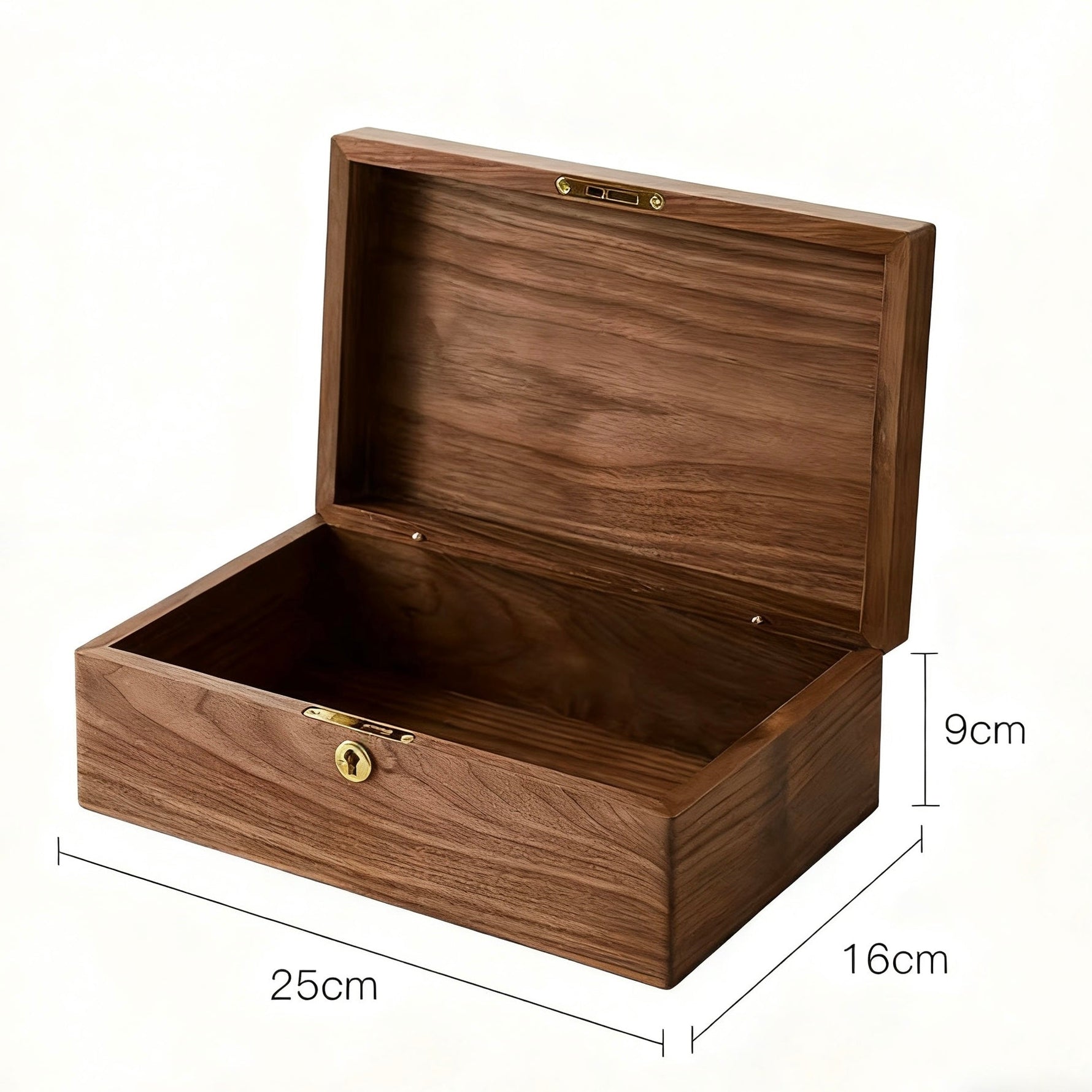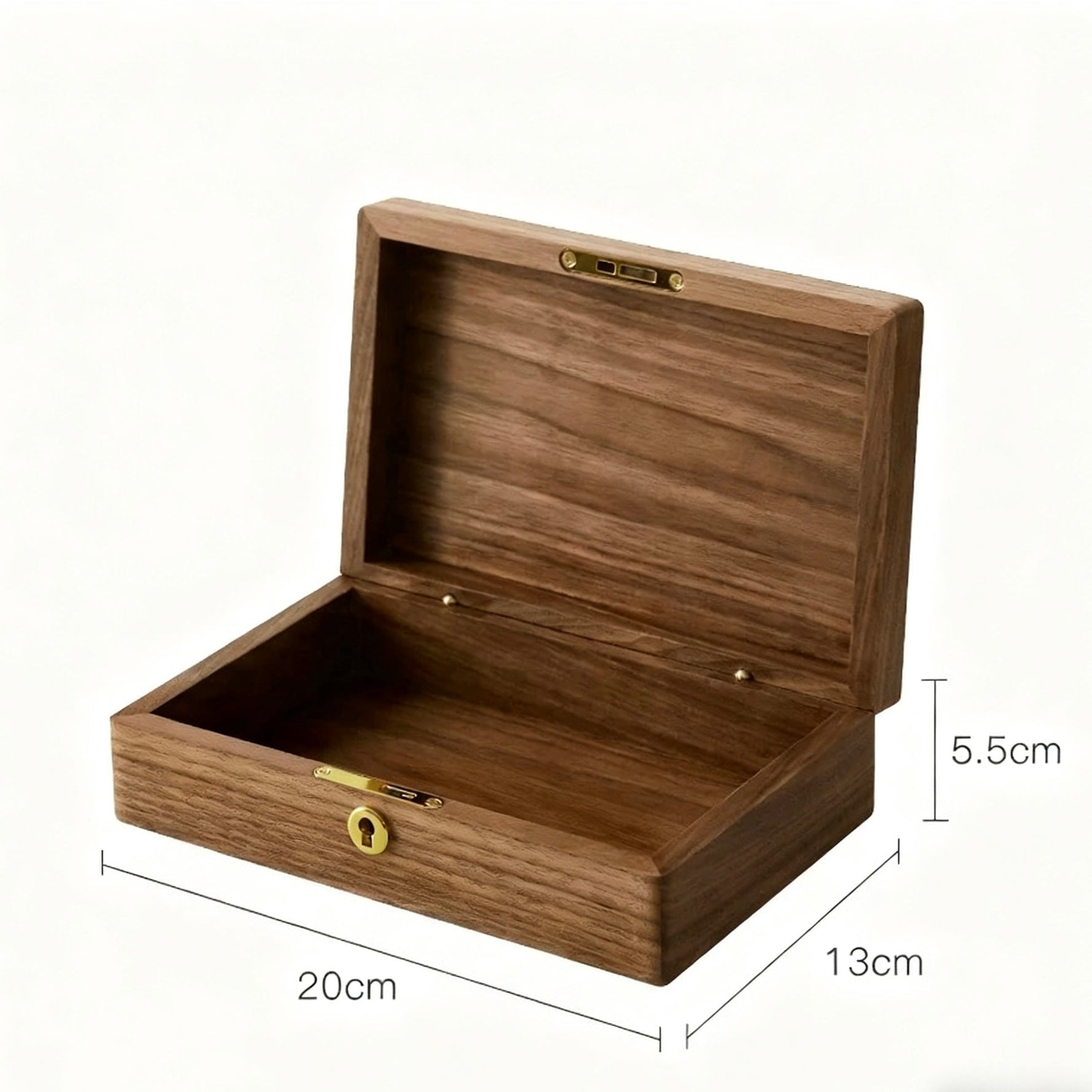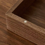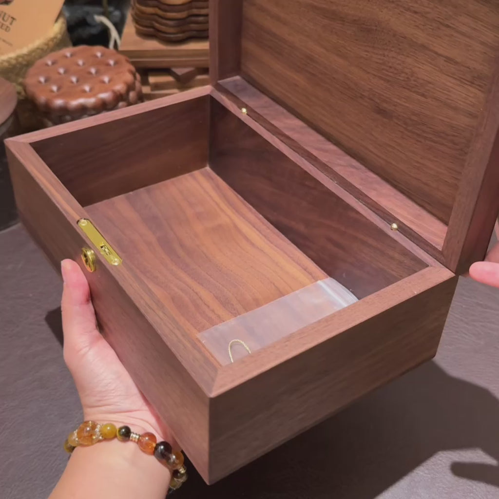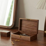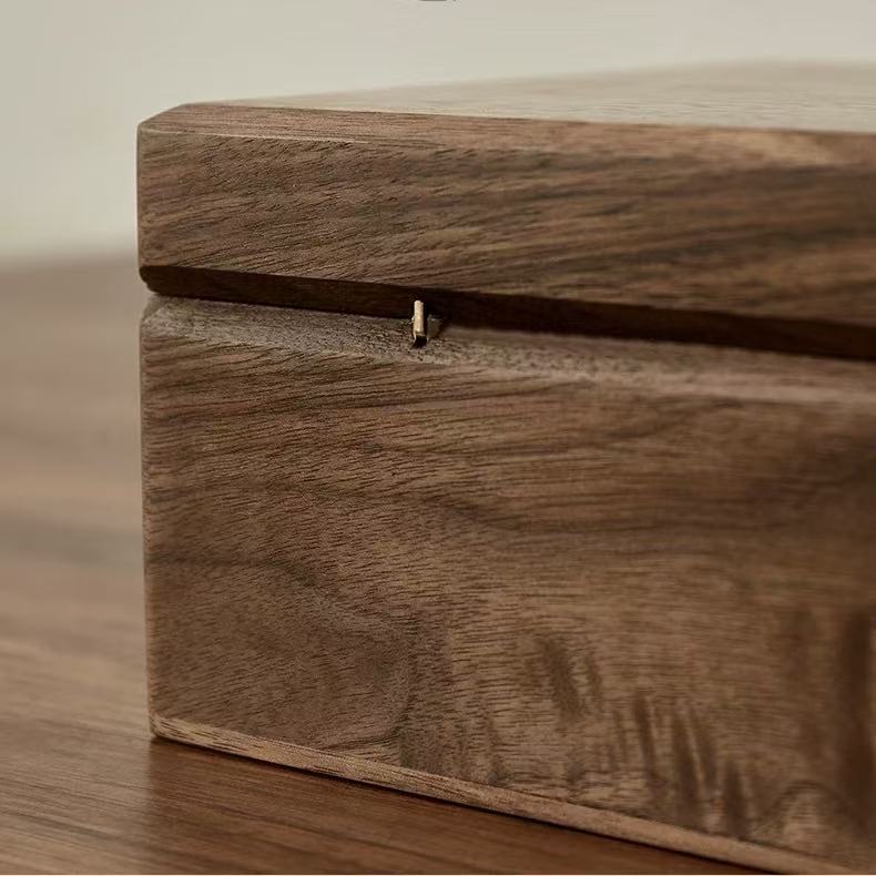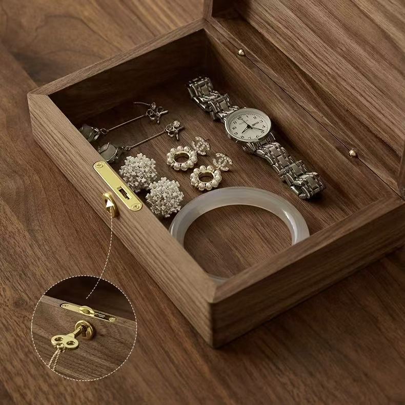 This box is made from North American black walnut, offering both beauty and durability. Its minimalist design and practical partitioning provide perfect storage for jewelry and small essentials. The unique, large round corner tenon joint adds a stylish touch, while the brass lock ensures your items stay secure.